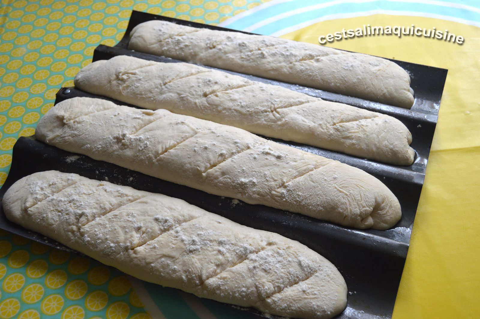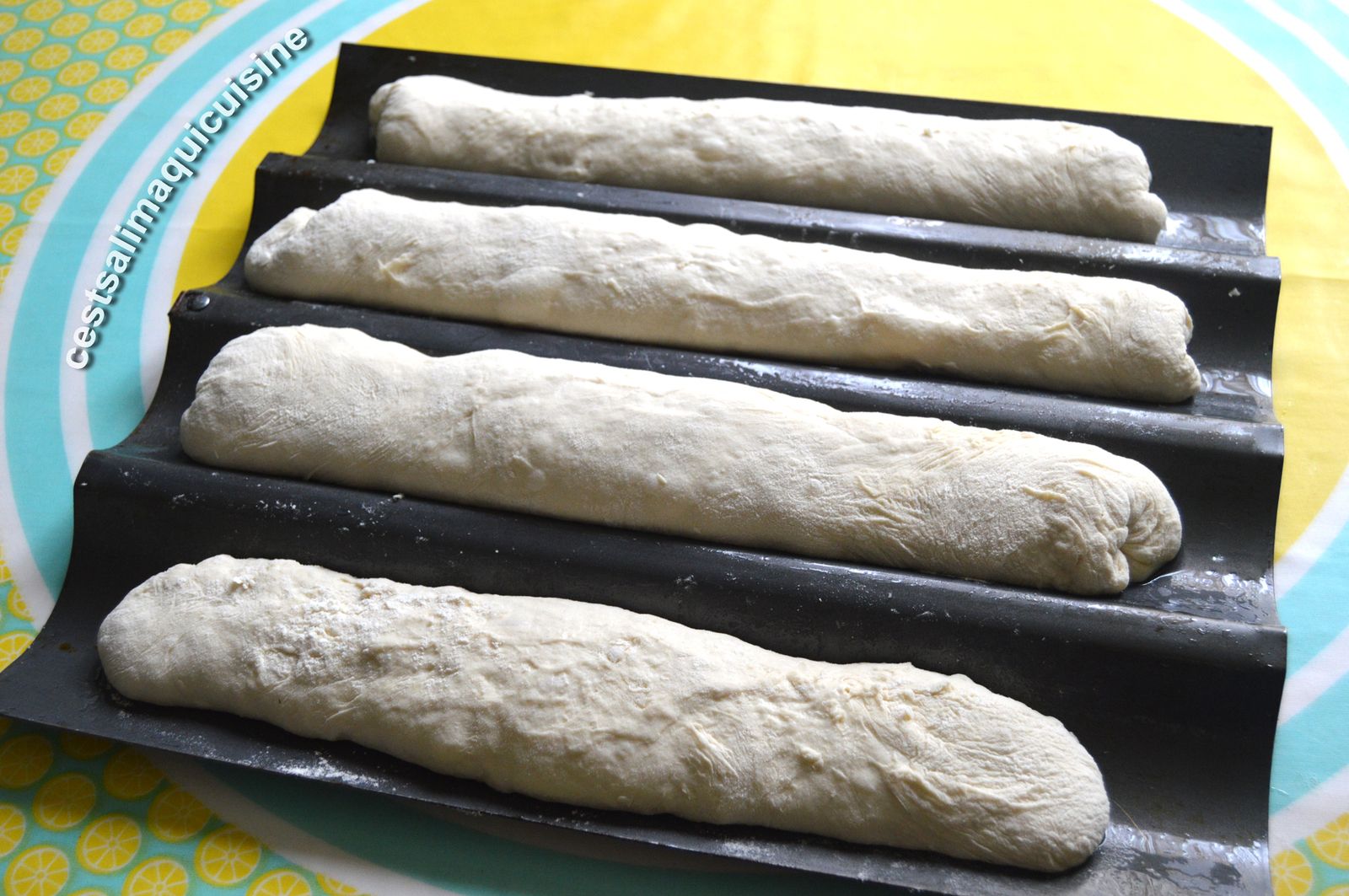 Façonner des baguettes et les déposer sur le moule à baguettes, couvrir d'un torchon propre et laisser lever 30 minutes.